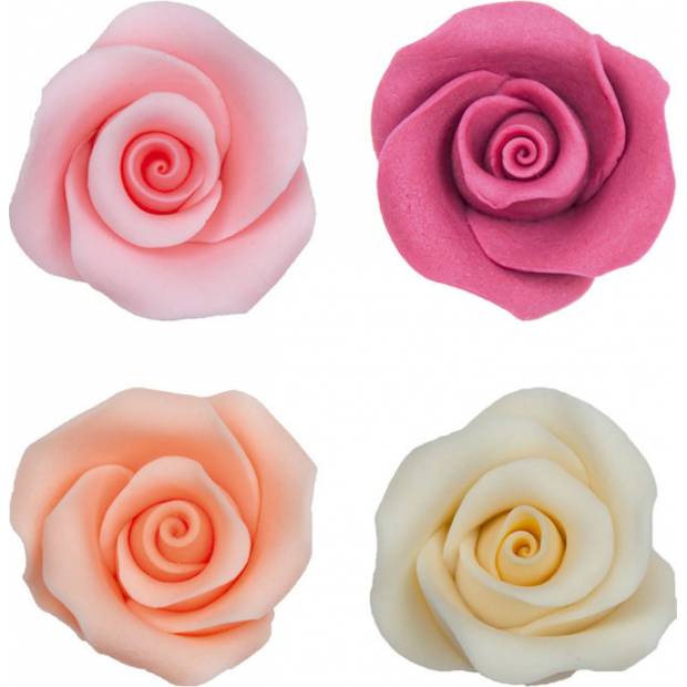 Gebrannte Zuckerrosen - 4 Farben: rosé, perlmutt, pfirsich und fuchsia. Durchmesser: 5 cm. Menge: 10 Stück pro Packung.