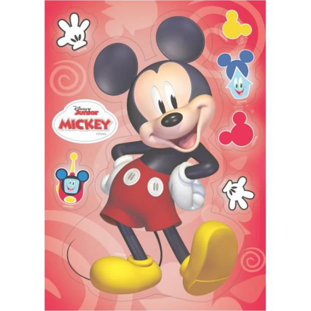 Gedrucktes Papier mit dem Motiv von Mickey Mouse enthält mehrere Silhouetten zur Herausnahme. Danach können Sie es einfach auf jede Oberfläche auftragen, z. B. Torten und Cupcakes, verschiedene Kekse.