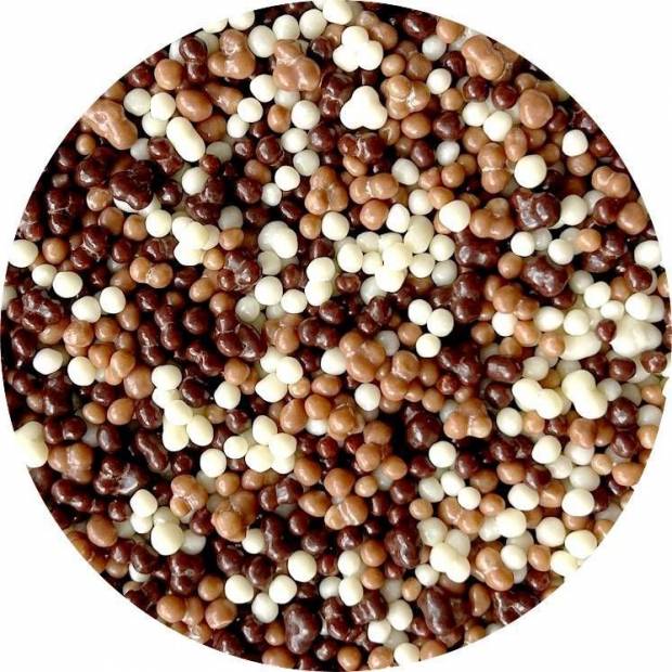 Essbare Dekoration aus Körnern in Milch-, weißer und dunkler Schokolade. Sehr beliebt als Konditor- Dekoration dank knuspriger Textur und eleganter Optik. Dank ihrer knusprigen Textur und des köstlichen Geschmacks eignet sie sich hervorragend als Dekoration für Kuchen, Gebäck, Cupcakes oder Eisbecher. Gleichzeitig verleihen sie Desserts ein attraktives Aussehen und einen interessanten Geschmackskontrast. Gemeinsam schaffen sie eine harmonische Mischung an Aromen, die nicht nur Kindern, sondern auch erwachsenen Naschkatzen Freude bereitet. Cereal-Makky ist ideal als finale Dekoration für Kuchen, Riegel, Cupcakes, Eisbecher und Dessertgläser. Seine knusprige Textur schafft einen angenehmen Kontrast zu weichem Teig oder cremigen Füllungen und verleiht dem fertigen Dessert eine neue geschmackliche und texturale Schicht. Außerdem wirkt es optisch sehr effektiv – eine Mischung aus hellen und dunklen Schokoladentönen verleiht jedem Werk ein elegantes und professionelles Aussehen. Dieses Produkt ist nicht nur eine schöne Ergänzung, sondern auch ein Geschmackserlebnis. Durch die Kombination aus zerbrechlichen Cerealkugeln und erstklassiger Schokolade wird es seinen Platz in jeder Haushalts- und Profiküche finden. Ein toller Helfer für jeden, der gern bäckt, dekoriert und mit Liebe zum Detail kreiert.