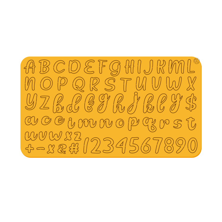 Mit einer Stempelalphabet-Schrift können Sie beliebige Wörter, Sätze und ganze Textzeilen auf Kuchen, Rolle oder anderes Dessert schreiben. Die Platte ist aus Kunststoff gefertigt und lässt sich sehr gut bearbeiten.