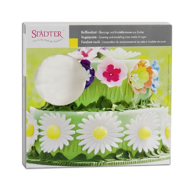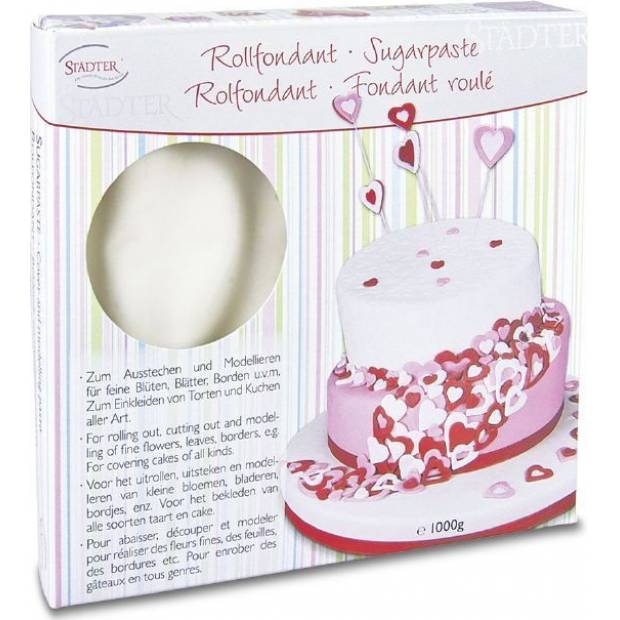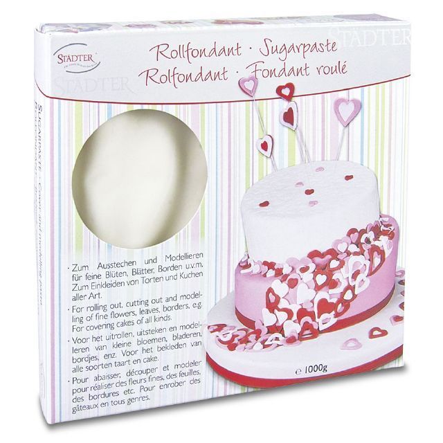 "Fondant - weiß ist ein formbarer Überzug für die Tortendekoration. Er ist einfach zu verwenden - man bedeckt die Torte mit ausgerolltem Fondant und glättet die Masse gründlich. Sie können den Fondant leicht mit verschiedenen gesundheitlich unbedenklichen