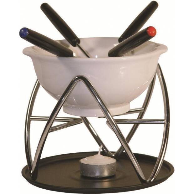Fondue-Set aus Keramik: Schüssel, Ständer, vier Gabeln.