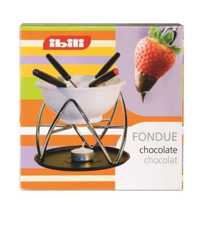 Schokoladenfondue-Set. Die Schokoladenschale ist aus Keramik, der Ständer ist aus hochwertigem Edelstahl. Das Paket enthält auch vier farbcodierte Fonduegabeln.Abmessungen:Durchmesser 13cm und Höhe 6cm