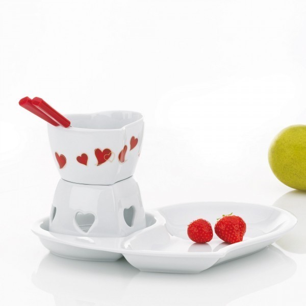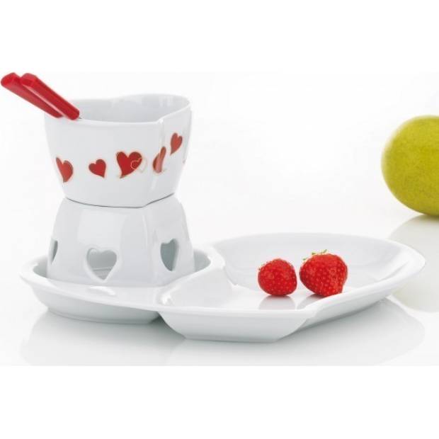Romantická sada na čokoládové fondue se „srdíčkovým“ designem. Ohřívací mísa má tvar srdce, ve stejném tvaru je i spodní část pro čajovou svíčku. Do sady patří ještě základní plocha a dvě nerezové vidličky s plastovou rukojetí.