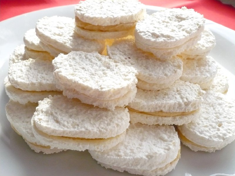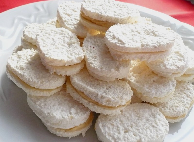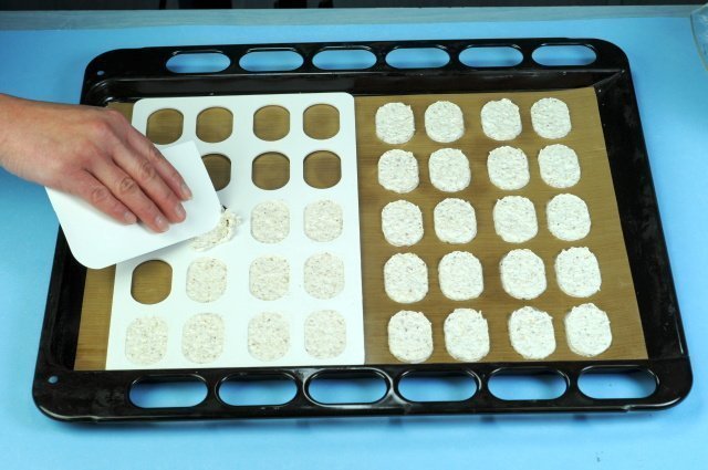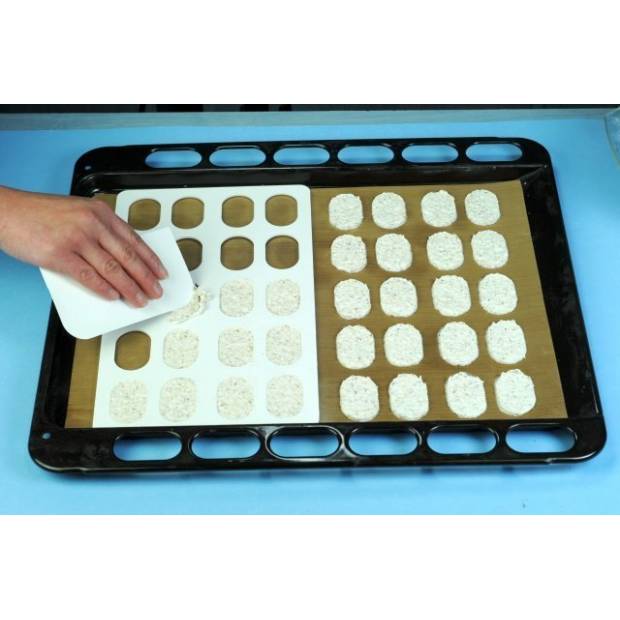 Schablone für Makronen auf das mit Backpapier ausgelegte Backblech legen. Mit der Spachtel die Masse auf die Makronen verteilen und die Schablone vorsichtig abziehen. So bereiten Sie 20 gleich große Makronen vor. Abmessungen der Schablone: 17,5 x 30 cm. Abmessung einer Makrone: 4,9 x 3,1 cm. Wir haben sie für Sie von einem Food-Blogger testen lassen: Form für Makronen besteht aus festem Kunststoff und ist für 20 Stück kleine ovale Stücke aus Eiweißschnee, Zucker und entweder Kokosnuss oder fein gemahlenen Nüssen bzw. Nusskernen bestimmt. Dem Produkt liegt ein Rezept mit ausführlicher Anleitung bei. Nach diesem Rezept lassen sich ca. 70 schon zusammengefügte Makronen herstellen. Legen Sie ein Backblech mit einer Antihaftfolie oder Backpapier aus; der Hersteller empfiehlt zusätzlich eine leichte Einfettung, aber ich denke, das ist nicht nötig. Legen Sie eine Hälfte des Blechs mit der glatten Seite nach oben und tragen Sie die Eiweißmasse in die Ovalformen auf. Die Oberfläche mit einer Winkelpalette glattstreichen und überschüssige Masse abwischen. Dann heben Sie die Schablone vorsichtig und langsam von einer Seite an, die Makronen fallen nach und bleiben auf dem Blech. Dasselbe wiederholen wir auf der anderen Blechsseite. Makronen backen wir zunächst 15 Minuten bei 120°C und anschließend trocknen wir sie bei 80°C mit leicht geöffneten Ofentüren. Abgekühlte Makronen kleben wir z. B. mit Karamell- oder anderem Creme und können sie noch mit Schokolade dekorieren. Mit der Schablone arbeitet man absolut hervorragend und einfach. Das Ergebnis sind Makronen gleicher Größe und Form, sodass diese Schablone Sie wirklich nicht enttäuscht. Im Angebot gibt es sie auch in anderen Größen und in runder Form, so hat jeder eine Auswahl. M.F.