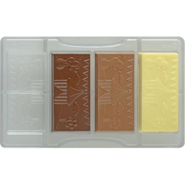 Vollständige Reihe grafischer Schokoladenmodelle umfasst eine Schokoladenform für Pralinen mit Zirkusmotiv. Professionelle Formen aus Polycarbonat, das Material, dank dem die Schokoladen transparent und perfekt sind. Sie fertigen vier Stücke Schokolade auf einmal an.