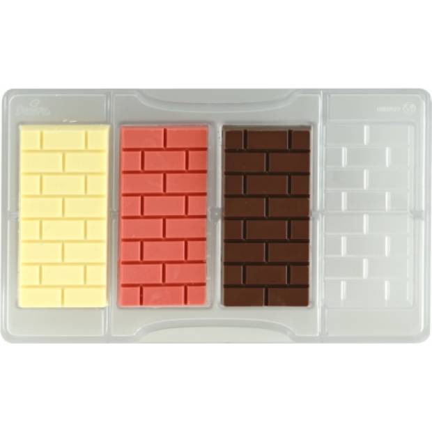 Komplettes Sortiment an grafischen Schokoladenmodellen umfasst eine Schokoladenform für Pralinen mit Ziegelstein-Motiv. Professionelle Formen aus Polycarbonat, das Material, dank dem die Schokoladen transparent und perfekt sind. Sie erstellen vier Stücke Schokolade auf einmal.