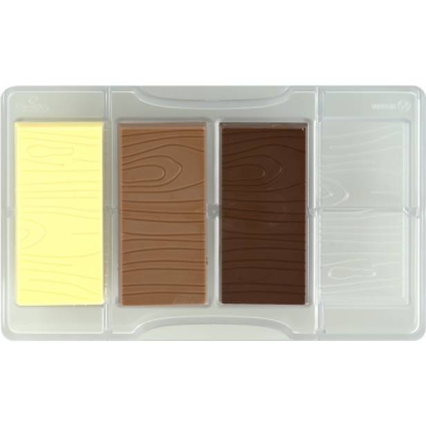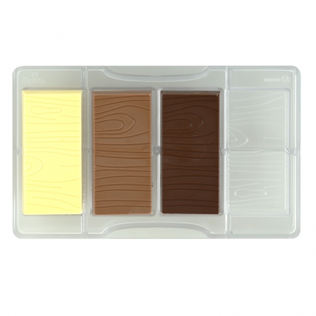 Komplette Reihe grafischer Schokoladenmodelle umfasst eine Schokoladenform für Pralinen mit Holzmotiv. Professionelle Formen aus Polykarbonat, das Material, dank dem die Schokoladen durchsichtig und perfekt sind. Sie erstellen vier Stück Schokolade auf einmal.