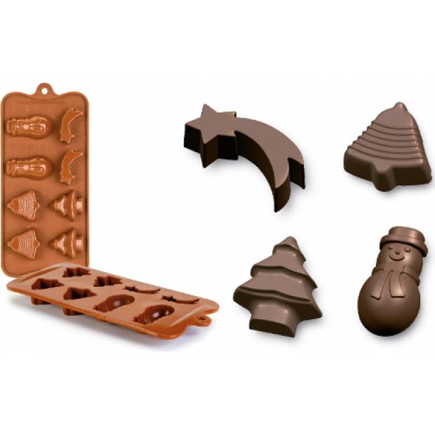 Nicht nur zu Weihnachten nutzen Sie diese praktische Form zur Herstellung hausgemachter Chocolade-Leckereien. Die fertigen Bonbons servieren Sie nach dem Abkühlen auf einem Teller oder Sie können sie als Überraschung in dekorativen bunten Folien verpacken. Die Abmessungen der Form betragen 10,5 x 21 cm, Höhe 2,5 cm, in der Form gibt es insgesamt acht Weihnachtsmotive, jedes ist doppelt vertreten. Da Silikon kälte- und hitzebeständig ist, ist es kein Problem, neben Schokolade auch andere Füllungen zu verwenden. Sie können in der Form auch leicht Eiswürfel mit Motiven wie Schneemann, Komete, Glocke und Tannenbaum herstellen, um Getränke zu kühlen. Silikonförmchen lassen sich sehr gut lösen, sie sind nicht klebend und ihre Reinigung ist überhaupt nicht schwierig.