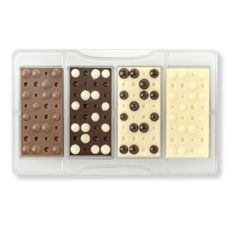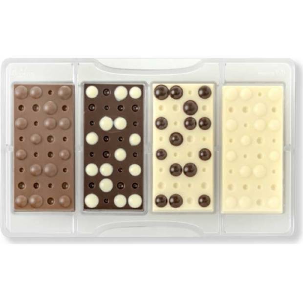 Sehr stabiles und hochwertiges Schokoladenform, das aus Polycarbonat hergestellt ist und die Form einer Schokoladentafel mit Blasen hat. Einfach temperierte Schokolade in die Form gießen, abkühlen lassen und aus der Form lösen. Die hergestellten Puzzleteile können verwendet werden, um Kuchen, Torten und viele andere Backwaren zu verzieren. Die Schokoladenform vor der Verwendung gründlich mit lauwarmem Wasser spülen. Vermeiden Sie die Verwendung von Drahtbürsten und scheuernden Reinigungsmitteln. Die Form ist hitze- und kältebeständig von -10 °C bis +50 °C. Nicht im Ofen verwenden!
