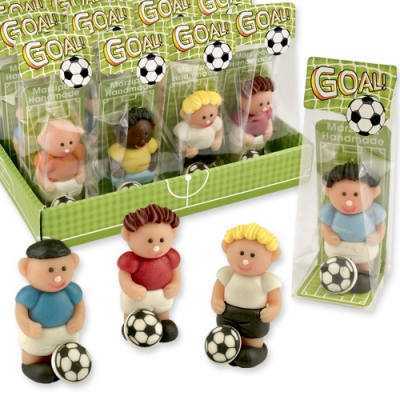 Essbare Dekoration in Form von Fußballspielern ist ein tolles Geschenk für Kinder und Erwachsene, die Marzipan mögen. Jede Marzipanfigur ist in einem Zellophanbeutel verpackt und steht auf einem festen Sockel. Die Abmessungen sind 30 x 25 x 60 mm, mit Beutel: 40 x 37 x 105 mm (24 g).