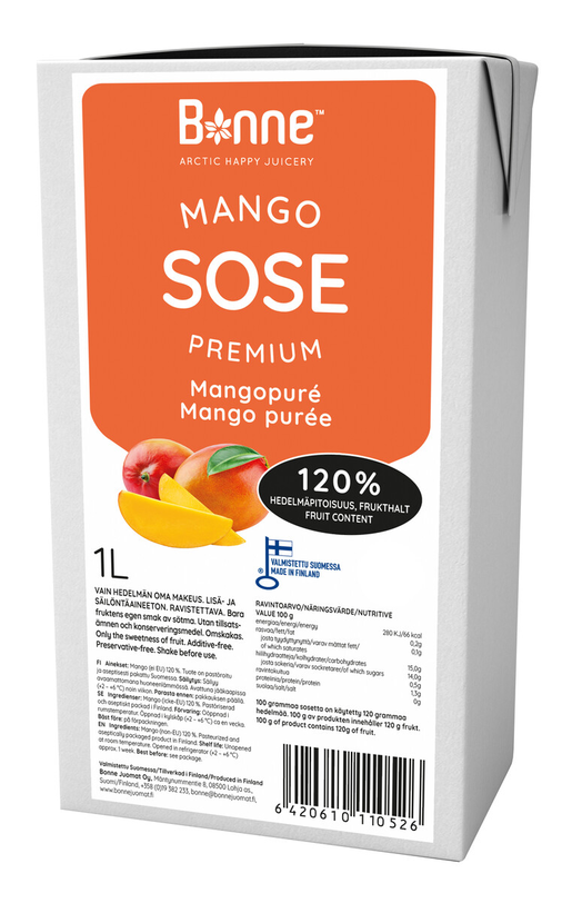 Begib dich mit uns auf eine exotische kulinarische Reise. Von nun an wird das Zusammenstellen neuer asiatischer Rezepte einfach und angenehm. Du musst nicht mehr nach reifem Obst suchen, um daraus ein schmackhaftes Gericht zu machen. Greife einfach zu unserem Püree, das aus exotischer Mango hergestellt wird. Ohne zusätzlichen Zucker, enthält es nur die natürlich im Obst vorkommenden Zucker. Reines Obstpüree ist zu 100% zuckerfrei, köstlich und vor allem gesund. Es enthält keine Konservierungsstoffe oder Süßstoffe. Es wird aus reifem und ausgewähltem Obst hergestellt. Das Obstpüree Bonne ist auch für Kinder geeignet, da es keine Zusatzstoffe wie Aromen, Zitronensäure, Zucker oder Glukosesirup enthält. Unsere Obstpürees sind eine großartige Lösung für die schnelle Zubereitung von nahrhaften SMOOTHIES, COCKTAILS, DESSERTS, KUCHEN, SAUCEN oder PÜREE. Das Produkt hat eine perfekt glatte Konsistenz – ohne Schalen und Kerne. Bonne Premium ist die einzige Marke in dieser Kategorie. Obstpüree Bonne Premium ist verzehrfertig als toller Snack oder kann in Brei oder Joghurt eingerührt werden. Unsere Pürees werden in Lohja, Finnland hergestellt und verpackt. 100 % Mango. Nährwert/Von 100 g Energie 274 kJ (65 kcal) Fett 0,3 g davon gesättigte Fettsäuren <0,1 g Kohlenhydrate 14,0 g davon Zucker 13,5 g Ballaststoffe 0,8 g Eiweiß 0,5 g Salz 0 g Haltbarkeitsdatum Ungeöffnet bei Raumtemperatur bis zum Mindesthaltbarkeitsdatum, geöffnet im Kühlschrank ca. 1 Woche.