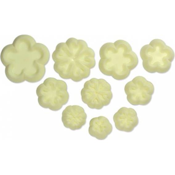 Ausstechformen in Form von Gänseblümchen und Primeln. Mit den Ausstechformen lässt sich sehr gut arbeiten. Die Größen der einzelnen Blüten reichen von 8 bis 25 mm. Geeignet für Modelliermasse, Marzipan, Fondant und weitere Backmischungen. Die Ausstechformen können in der Spülmaschine gewaschen werden. In der Packung 10 Stk.