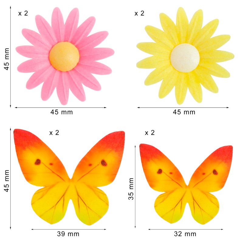 Essbare Dekorationen in Form von Blüten und Schmetterlingen sind zarte Verzierungen, die sich für Kuchen, Rouladen und andere Backwaren eignen. Sie dienen der endgültigen Dekoration.