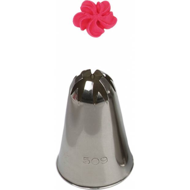 Metall-Aufsatz für Tortenzubehör, geschnitten 509/1F, garantiert präzente und einzigartige Verzierung. Die Spitze lässt sich wiederholt mit einem Spritzbeutel verwenden. Sie ist aus Edelstahl gefertigt, Fettflecken bleiben auf der Oberfläche nicht haften. Nicht geeignet für die Spülmaschine.