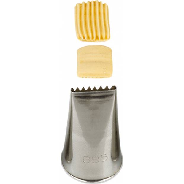 Metall-Pastry-Verzierungs-Tülle flach 895/2B für einfaches Erzeugen kreativer Creme-Elemente. Die Tülle kann wiederholt mit einer Sterntülle verwendet werden. Sie ist aus Edelstahl gefertigt, Fettflecken bleiben auf der Oberfläche nicht zurück. Nicht spülmaschinengeeignet.