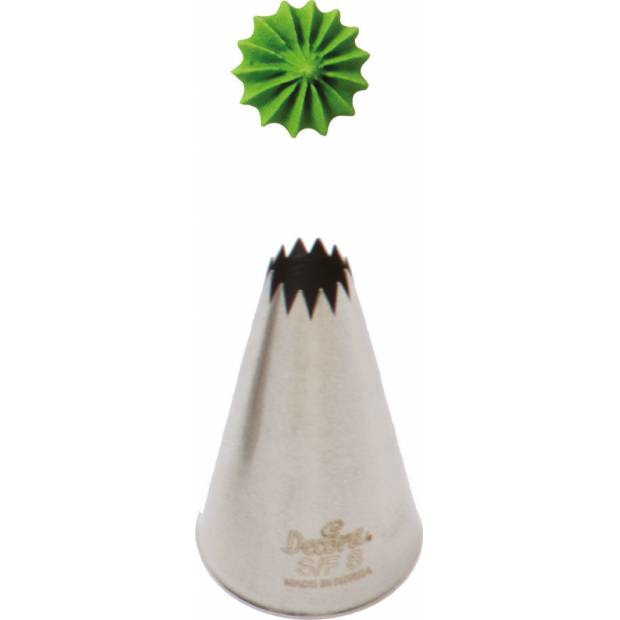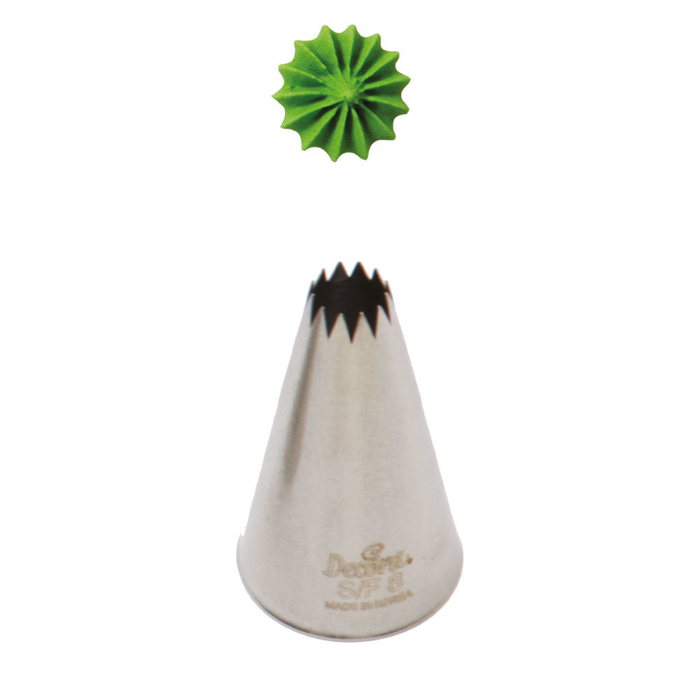 Der Metall-Verzieraufsatz für Tüllenschnitt S/F8 garantiert eine präzise und einzigartige Dekoration. Die Spitze kann wiederholt mit einer Spritztüte verwendet werden. Sie besteht aus Edelstahl, Fettflecken hinterlassen sich nicht auf der Oberfläche. Geeignet ist sie nicht für die Spülmaschine.