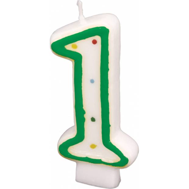 Eine fröhliche Kerze in Zahlform bedeckt auf der Vorderseite mit fröhlichen Tupfen. Die Kerze ist auf einem Kunststoffständer am Geburtstagskuchen befestigt. In Kombination mit weiteren Ziffern ergibt sich eine beliebige Zahl. Eine hervorragende Kuchen-Dekoration, um Einzigartigkeit und kommende Geburtstage zu betonen.