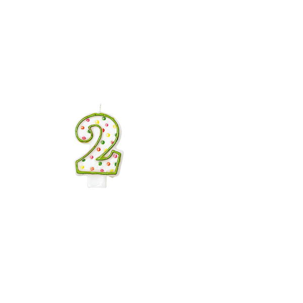 Eine Geburtstagkerze hat die Form einer Ziffer und fröhliche bunte Punkte. So können Sie beliebige Ziffern miteinander kombinieren und so wichtige Daten für Ihre Familie erstellen. Die Kerze ist mit einem Plastikständer am Geburtstagkuchen befestigt.