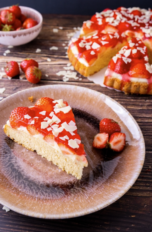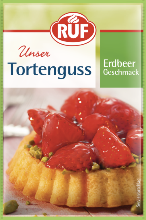 Gelatinepulver mit Erdbeergeschmack ist einfach zuzubereiten. Sie fügen außerdem hinzu: 250 ml (1/4 l) Wasser, 2 gehäufte Esslöffel Zucker Zubereitung: In einen kleinen Topf 250 ml Wasser gießen. Den Inhalt der Packung und 2 gehäufte Esslöffel Zucker hinzufügen und gut mit einem Schneebesen verrühren. Unter ständigem Rühren die Flüssigkeit zum Kochen bringen. Die Kuchen-Glasur lässt man 1 Minute lang etwas abkühlen. Anschließend gleichmäßig über dem Obst bedeckten Kuchen verteilen und fest werden lassen. Den Kuchen erst nach vollständigem Abkühlen der Glasur schneiden.