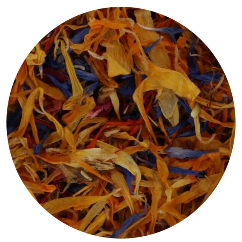 Rosenblütenblätter (getrocknet), Ringelblumenblüten (getrocknet), Kornblumen (getrocknet), Färberdisteln (getrocknet).