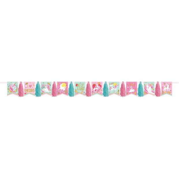 Dekorative Girlande mit dem Motiv der beliebten Einhörner. Sie lässt sich bequem drinnen und auch auf der Terrasse aufhängen. Diese Buchstaben-Girlande wird sich bei Feiern zu Hause, in Kindergärten und im Kinderzimmer gut machen. Anschließend dient sie als Dekoration. Länge 304 cm.