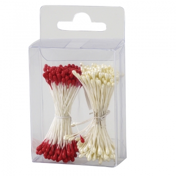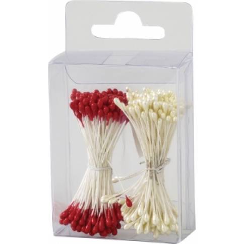 Samtige Stäbchen in Weiß- und Rottönen für die Blütenstände von sogenannten essbaren Blüten, hergestellt aus Zuckerguss. Die Blütenstempel sind nicht essbar, dienen aber dem realistischen Aussehen der Zuckerblume.