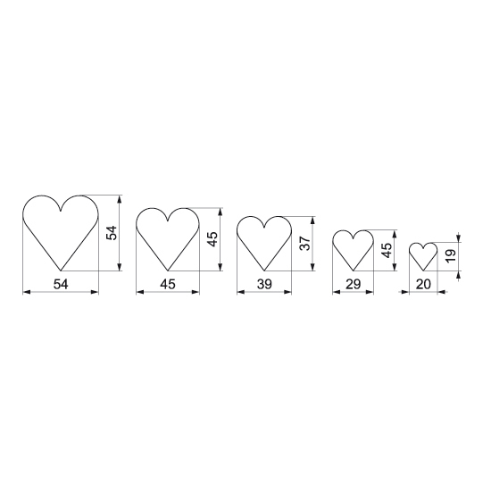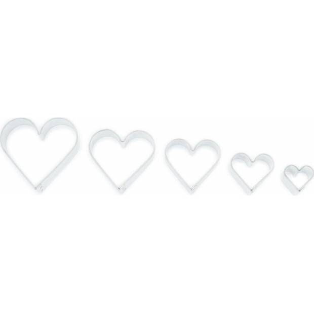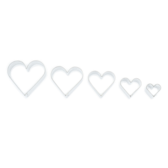 Herzförmige Ausstechformen in fünf verschiedenen Größen (von 2 bis 5,4 cm) aus verzichtbarem gesundheitlich unbedenklichem Blech. Die glatte Oberfläche der Ausstecher lässt sich gut reinigen. Die Bandhöhe beträgt 16 mm.
