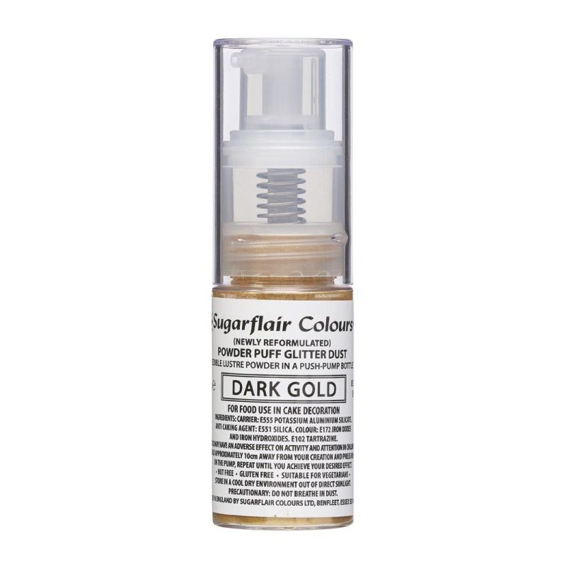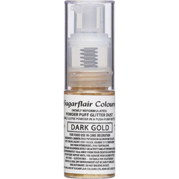 Beenden Sie Ihre Kreationen mit dem Sugarflair-Sprühspender mit Glitzerpulver. Dieses Spray ist einfach zu verwenden und eignet sich hervorragend zum Dekorieren von Cupcakes, Kuchen, Dekorationen und vielem mehr. Anwendung: Halten Sie ca. 10 cm von Ihrer Kreation entfernt und drücken Sie auf den Pumpkopf, wiederholen Sie den Vorgang, bis der gewünschte Effekt erreicht ist. Auf jeden 1 kg Kuchen und Dekoration sollten Sie nicht mehr als 2 Gramm Farbe verwenden. Dieses Spray arbeitet mit Luft und enthält keinen Alkohol.