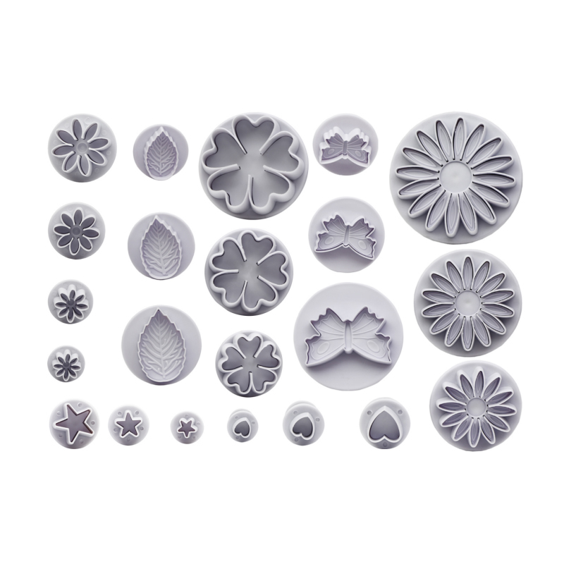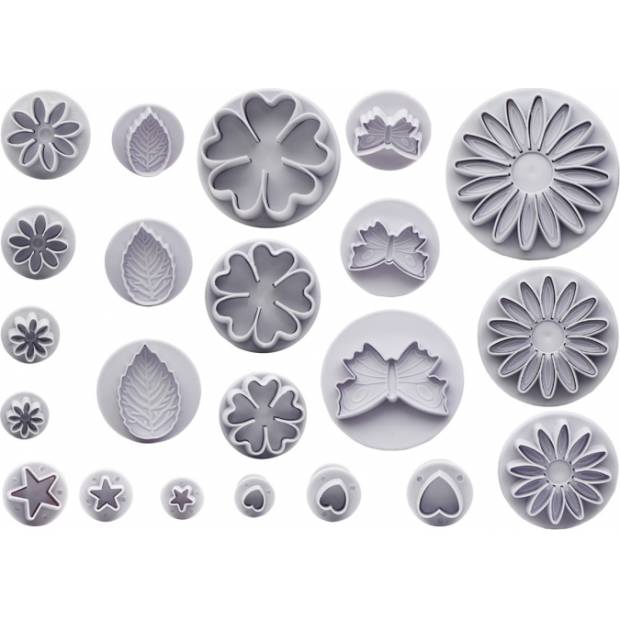 Gusspresse-Ausstechformen sind ein großartiges Hilfsmittel zur Herstellung genauer Formen aus Marzipan, Fondant oder Gum paste. Das Set enthält einen Schmetterling, Blätter und Blüten. Man arbeitet sehr gut damit.