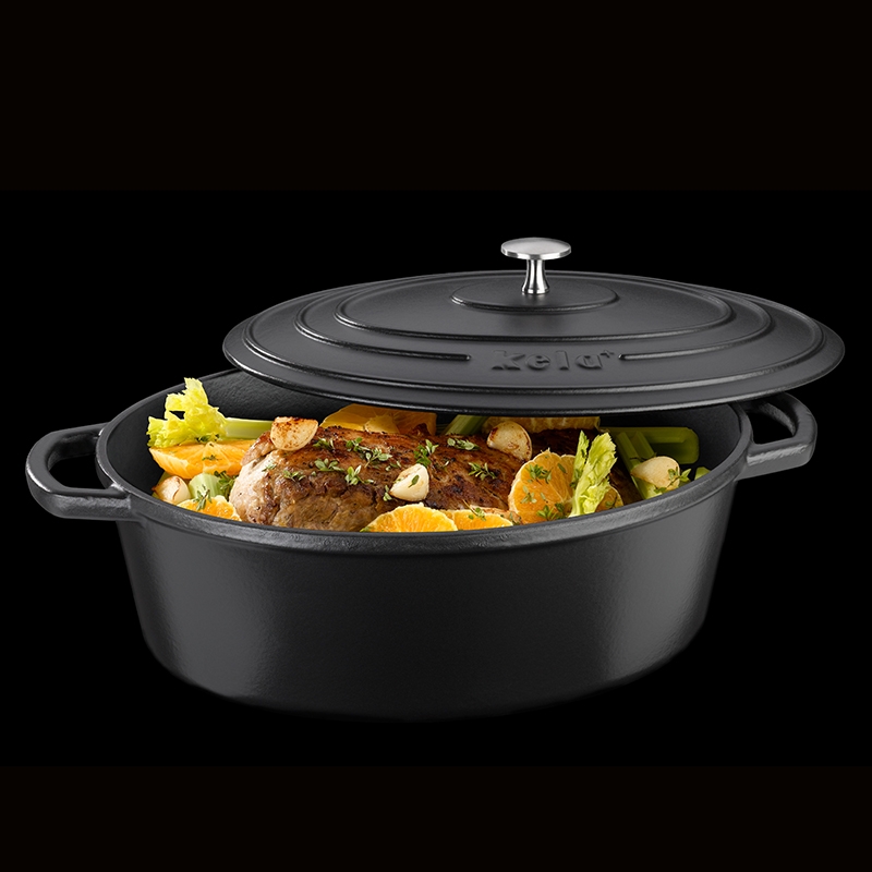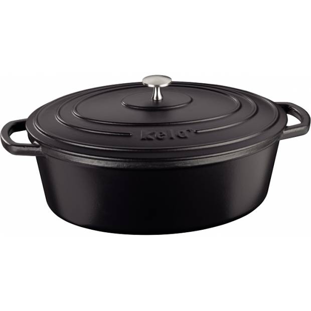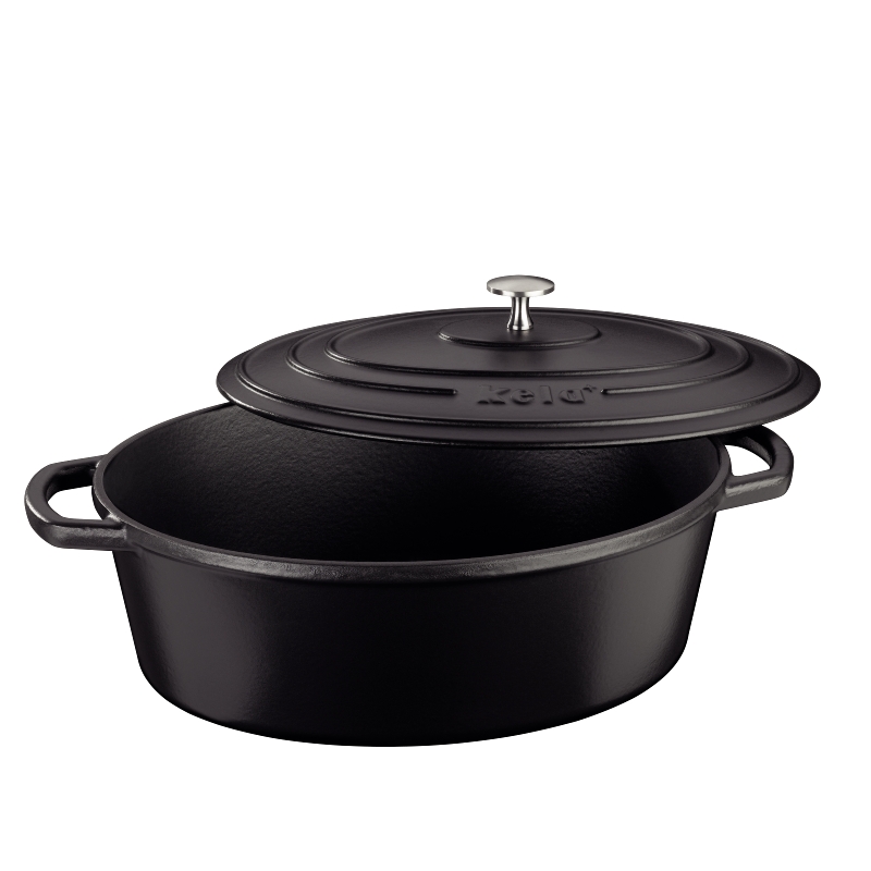 Gusseiserner Topf Calido Oval, 33 x 26 x 12 cm, Fassungsvermögen 6,0 l, mattierte Oberfläche, in schwarzer Farbe mit Deckel. Bis zu 300°C verwendbar. Gesamtlänge inklusive Griffen: 42 cm. Bodenfläche 27,5 x 19,5 cm.