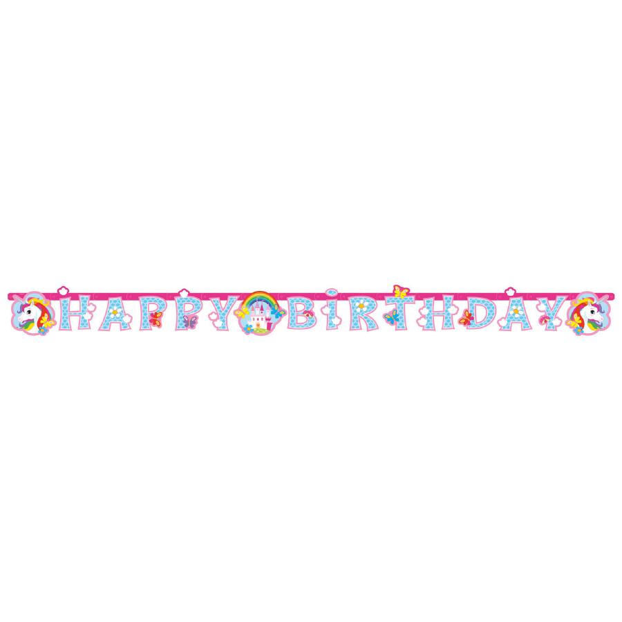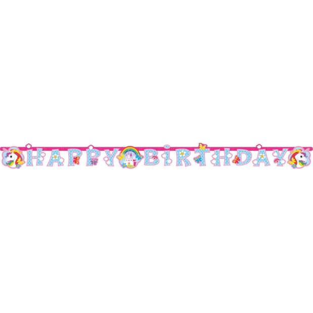 Geburtstagsgirlande mit dem Motiv Happy Birthday Unicorn. Sie können sie bequem drinnen sowie auf der Terrasse aufhängen. Diese Buchstaben-Girlande wird bei Feiern zu Hause, in Kindertagesstätten, im Kinderzimmer gut aussehen. Anschließend dient sie als Dekoration. Abmessungen 180 x 15 cm.