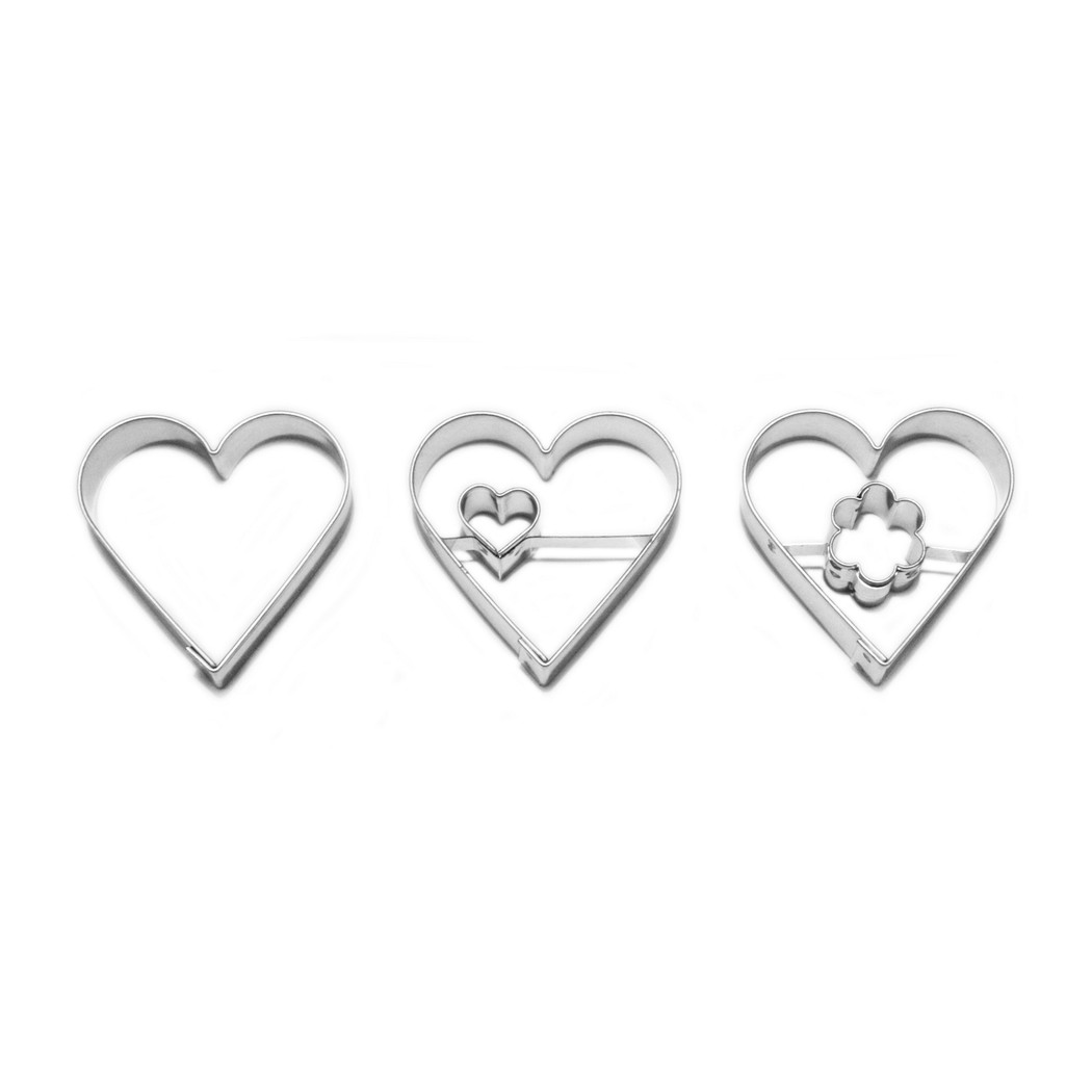 Satz von drei Ausstechformen mit unterschiedlichen Innenformen in Herzform.