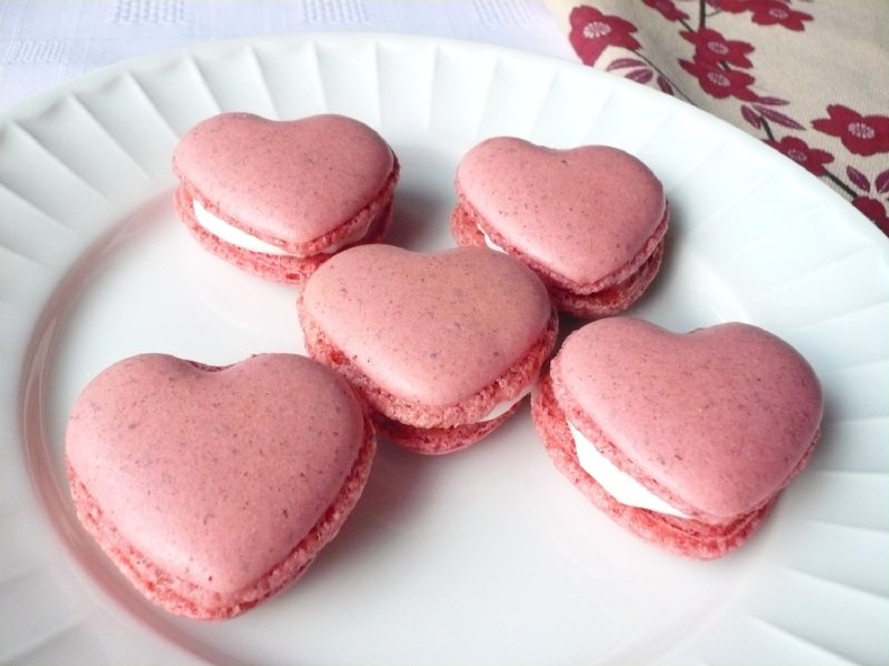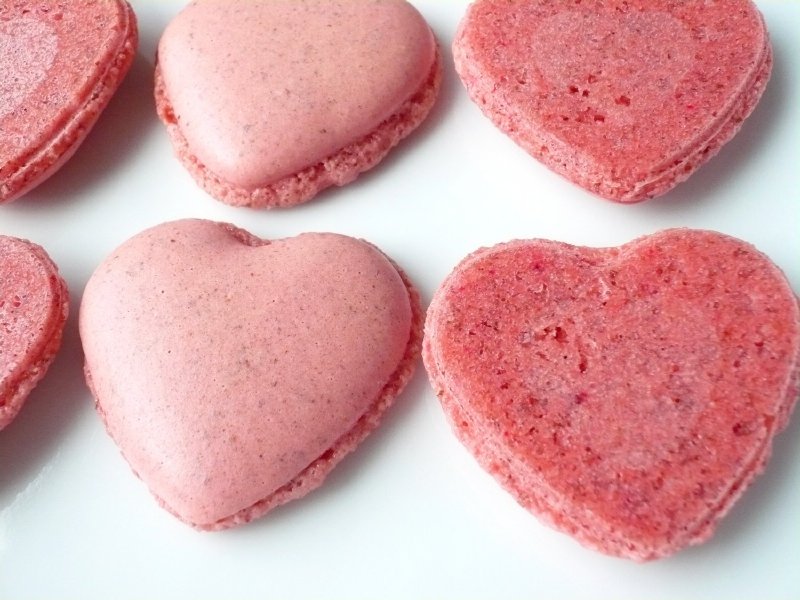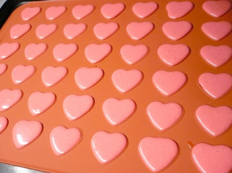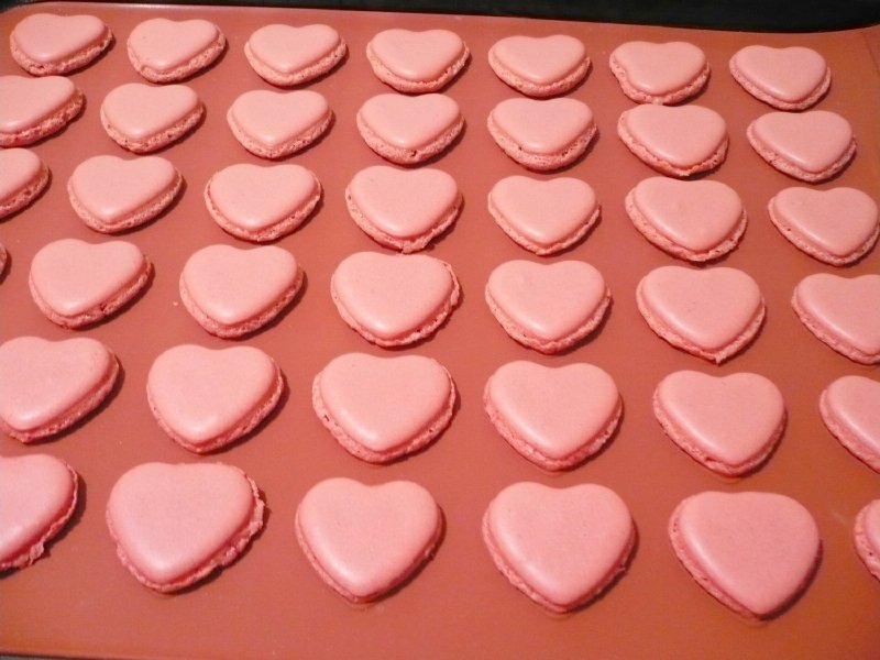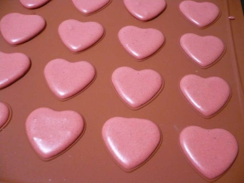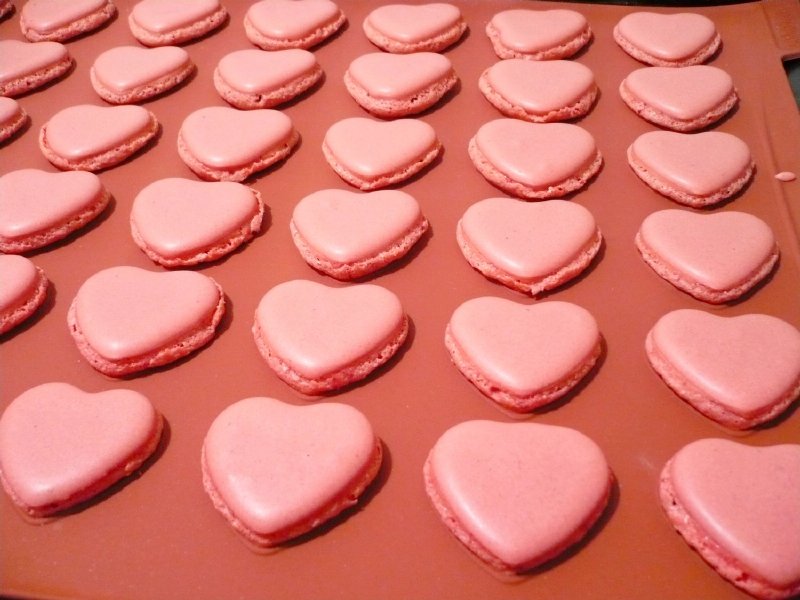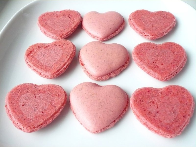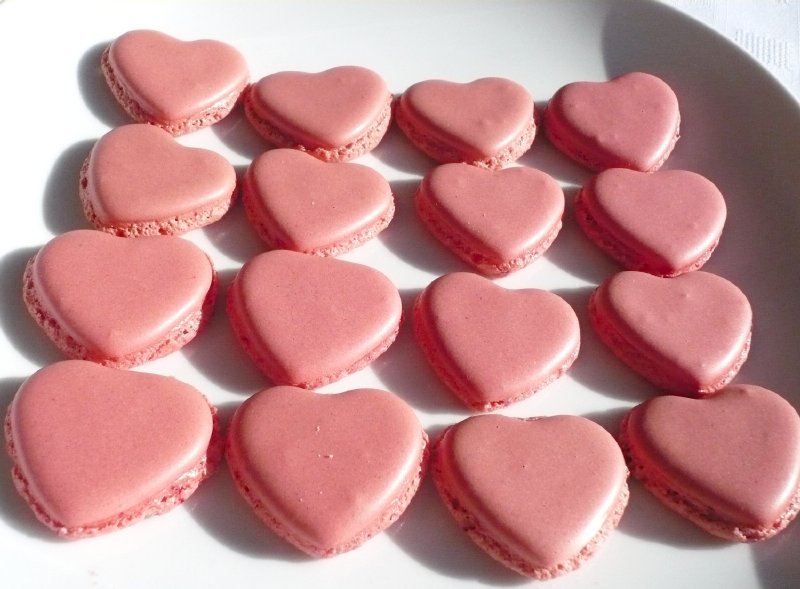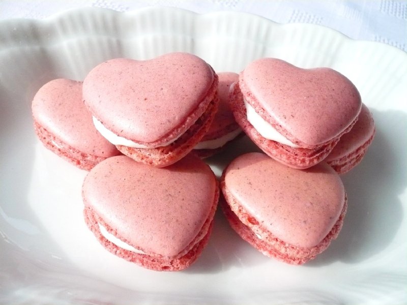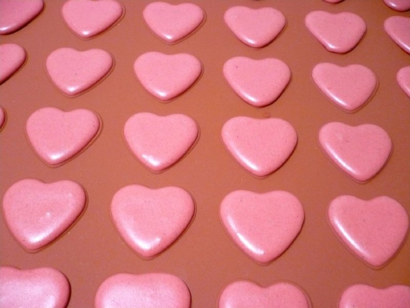 Makronen muss man nicht fürchten, auch wenn es beim ersten Mal nicht gleich klappen sollte, wird jeder den Fehler im Vorgehen erkennen und beim nächsten Mal vermeiden. Beim ersten Versuch kann man es zum Beispiel mit der halben Menge versuchen. Manche verwenden bei der Herstellung einen heißen Zuckerrunnersatz, der in das Eiweiß eingerührt wird. Ich mache es nach einer anderen Vorgehensweise, aber am besten ist immer die eigene Erfahrung und Zufriedenheit mit dem Ergebnis. Alle Schritte des Verfahrens sind bei der Herstellung von Makronen wichtig. Wie man das steife Eiweiß mit dem Kristallzucker schlägt und Farbstoff hinzufügt. Danach folgt das Unterheben von fein gemahlenen Mandeln mit Puderzucker. Die Mischung aus Mandeln und Zucker sollte man noch zu einer glatten Mehlkonsistenz verarbeiten und sieben, damit die Mischung wirklich fein wird. Es wird eingerührt und so lange gestrichen, bis der Makronenmasse Glanz verleiht und langsam und träge von der Spachtel läuft. Ist die Masse zu dick, läuft sie nicht in Form von Herzchen auseinander und hat eine ungleichmäßige Oberfläche. Aber man darf sie auch nicht zu stark schlagen, das würde sie zu flüss machen. Mit der korrekt verkneteten Mischung füllt man einen Spritzbeutel mit glatter Spitze und füllt die Öffnungen der Form in Herzform. Die Form befindet sich auf einem Backblech. Nach dem Füllen der gesamten Form klopft man das Blech mehrmals auf den Tisch, oder man hebt das Blech mit einer Hand an und klopft von unten mit der anderen Hand. Der Teig sollte gleichmäßig langsam in die Herzchenformen fließen und eventuell vorhandene Luftblasen herausdrücken. Dann lässt man die Makronen an der Oberfläche gut trocknen, sie dürfen sich beim leichten Berühren nicht kleben. Das dauert eine Stunde oder länger, je nach Raumtemperatur. Danach schieben wir das Blech in den auf ca. 150°C vorgeheizten Ofen und backen die Makronen ca. 13 Minuten. Die Ofentemperatur und die Zeit sind nur Orientierung. Jeder Ofen backt etwas anders und beim Backen auf dem Untergrund backt es ca. 1 - 2 Minuten länger als direkt auf dem Blechn. Wenn wir uns unsicher sind, kippen wir oben von der Spitze eine Makrone an, ist sie fest und gibt nicht nach, dann ist sie wahrscheinlich durchgebacken. Das Backblech herausnehmen und nach vollständigem Abkühlen die Makronen entfernen. Anschließend füllen wir sie mit Creme und vor dem Servieren lassen wir sie etwa 10 Stunden ruhen.