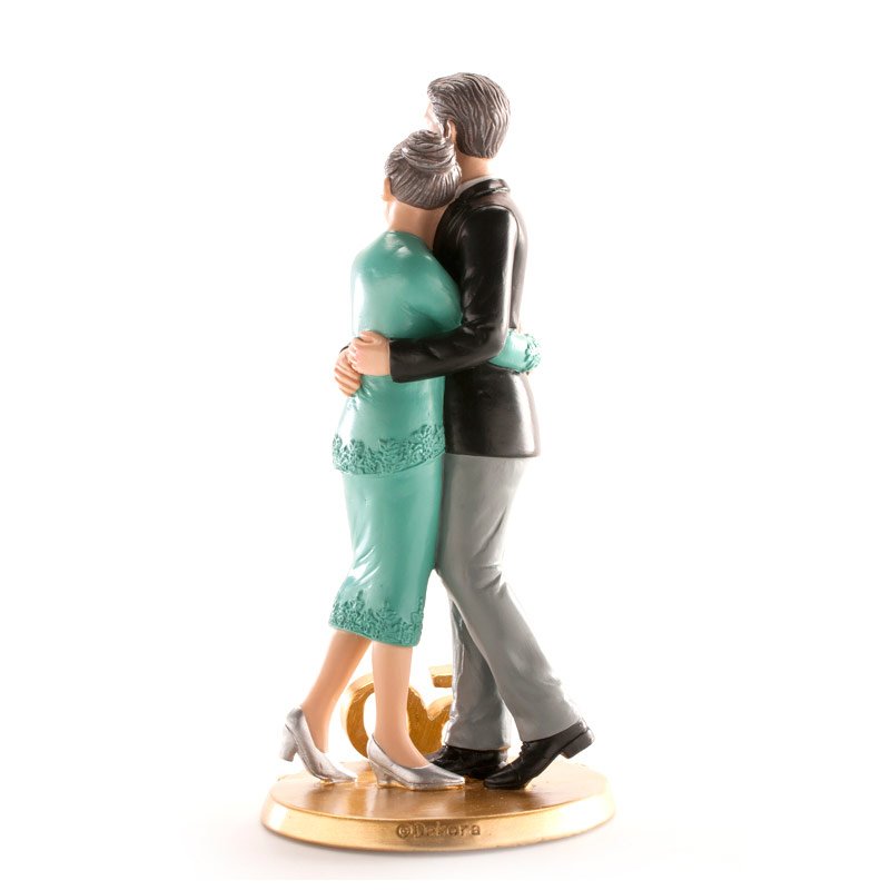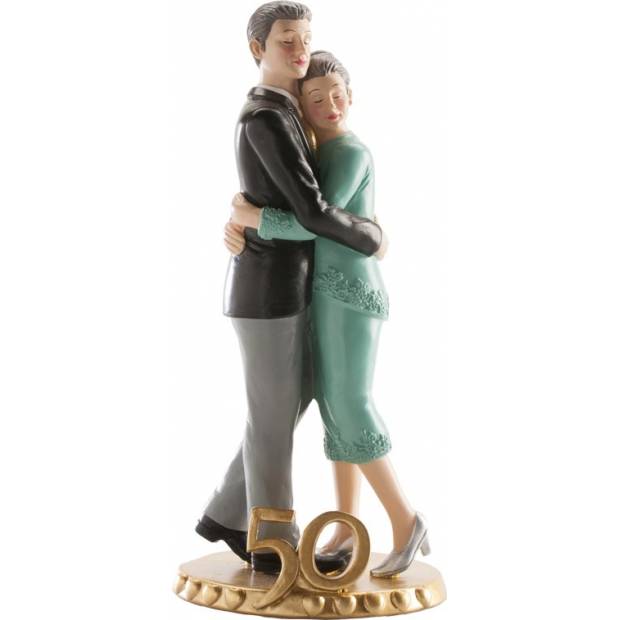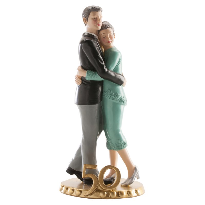 Elegante festliche Dekoration ist ideal zum Verzieren von Hochzeitstorten zum Jubiläum der Goldenen Hochzeit. Die Hochzeitsfigur ist eine einfache und elegante Lösung zum Dekorieren von Torten. Die Hauptfiguren dieser dekorativen Figur aus Harz sind ein Ehepaar, das die Goldene Hochzeit feiert, in einer Umarmung. Am unteren Rand ist die Zahl 50 markiert. Sie zeichnet sich durch einen spontanen, lustigen und eleganten Stil aus. Sie erfüllt alle Anforderungen europäischer Normen und ist lebensmittelsicher. Das Produkt ist für den professionellen Einsatz in Konditoreien geeignet. Diese ungiftige Dekoration kann wiederverwendet werden; Sie können sie als Erinnerungsstück an Ihren Hochzeitstag aufbewahren. Höhe 19 cm.
