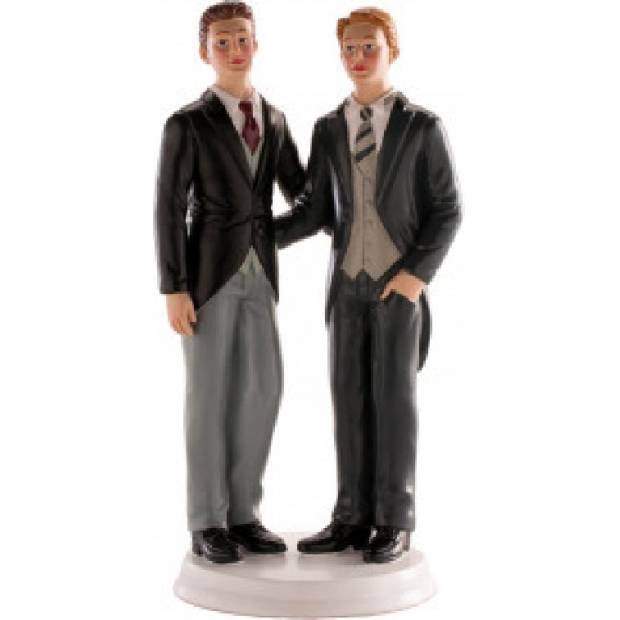 Ideales Figurchen für die Dekoration einer Hochzeitstorte bei einer Homo-Hochzeit. Dieser Topper stellt ein Paar elegant gekleideter Männer dar: Der dunkelhaarige Mann trägt einen grauen und schwarzen Anzug, während der Blondhaarige einen klassischen Smoking trägt. Diese Hochzeitsfigur erfüllt alle Anforderungen europäischer Normen und ist lebensmittelecht. Das Produkt eignet sich für den professionellen Einsatz in Konditoreien. Diese unessbare Dekoration kann mehrfach verwendet werden, Sie können sie als Erinnerung an Ihren Hochzeitstag aufbewahren. Hergestellt aus Harz. Höhe 19 cm.
