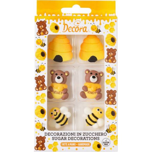 Bringen Sie Ihren Desserts mit dekorativen Zuckerfiguren Decora – Honig eine verspielte und fröhliche Optik. Dieses Set enthält 6 handgeformte Figuren – lächelnde Bienen, Bären mit Honigtasse und kleine Beuten. Jedes Stück wird mit Detailgenauigkeit gefertigt und verleiht Ihren Kuchen und Gebäcken einen originellen und einzigartigen Effekt. Die Dekorationen bestehen aus hochwertigem Zuckerwerk mit sicheren Farbstoffen, sie schmecken sanft und haben gleichzeitig eine feste Struktur, wodurch sie gut ihre Form halten. Sie sind glutenfrei und geeignet für eine breite Kundengruppe. Verwendung - Dekoration von Geburtstagskuchen - Verzierung von Muffins, Cupcakes und Plätzchen - Thematische Feiern mit Kindermotiv - Süße Buffets und Candy-Bars Produktvorteile - 6 Stück pro Packung – ideal für kleinere und größere Kreationen - handgefertigt mit Detailgenauigkeit - schöne, auffällige Farben und verspieltes Design - einfache Anwendung auf jeder Oberfläche (Trockencreme, Fondant, Glasur)