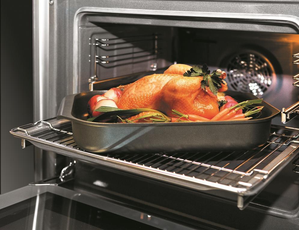 Universeller Bräter aus Gusseisen mit zwei Teflon-Schichten und spezieller Edelstahloberfläche (rostfreier Stahl mit 18% Chrom). Geeignet für alle Heizarten, einschließlich Induktion. Ideal zum Braten, Überbacken und klassischem Backen. Spülmaschinenfest.