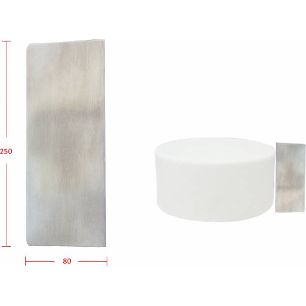 Edelstahl-Backspachtel ohne Skala. Spülmaschinengeeignet. Geeignet für Arbeiten mit Sahne oder Ganache für eine glatte Oberfläche. Abmessungen 25 x 8 cm.