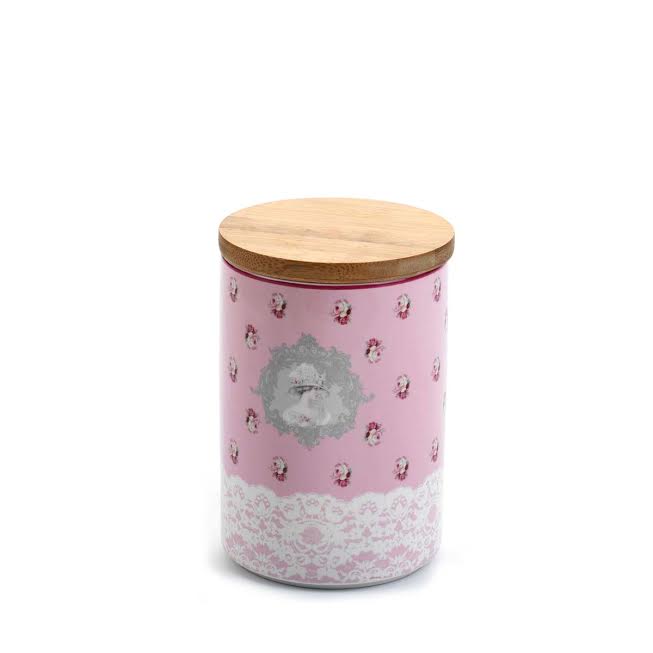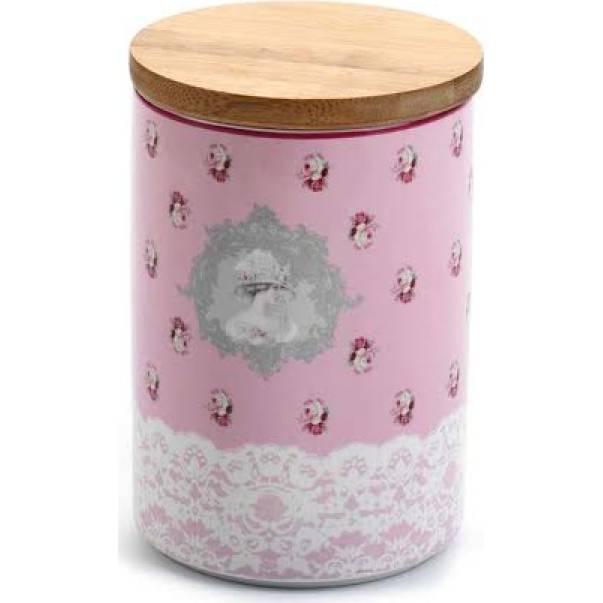 Praktická elegantní dóza na skladování cukroví, surovin na pečení, či koření má růžovou barvu s dekorem dámy a drobných růžiček. Je vyrobená z keramiky. Víko je dřevěné. Rozměry 11 x 16 cm (průměr x výška).
