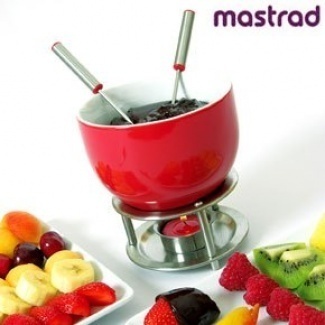 Genießen Sie Obst und Gemüse, das in heiße und köstliche Schokolade getaucht ist. Kaufen Sie ein modernes Fondueset, das vier Gabeln hat. Die Basis besteht aus einer Edelstahlkonstruktion, in die eine Kerze eingesetzt wird, um die Schokolade heiß zu halten. Die Schokolade wird in einer roten, temperaturbeständigen Keramikschüssel zubereitet.