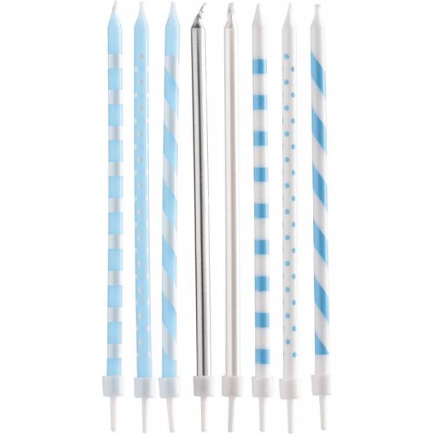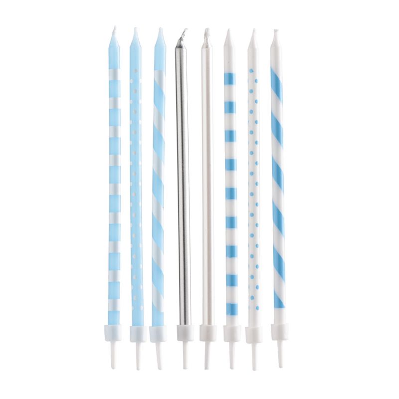 Blaue, weiße und silberne Kerzen, ideal zum Dekorieren einer Geburtstagstorte. Die Verpackung enthält 16 Kerzen und 16 Halter. Die Kerzenhöhe beträgt 13 cm.