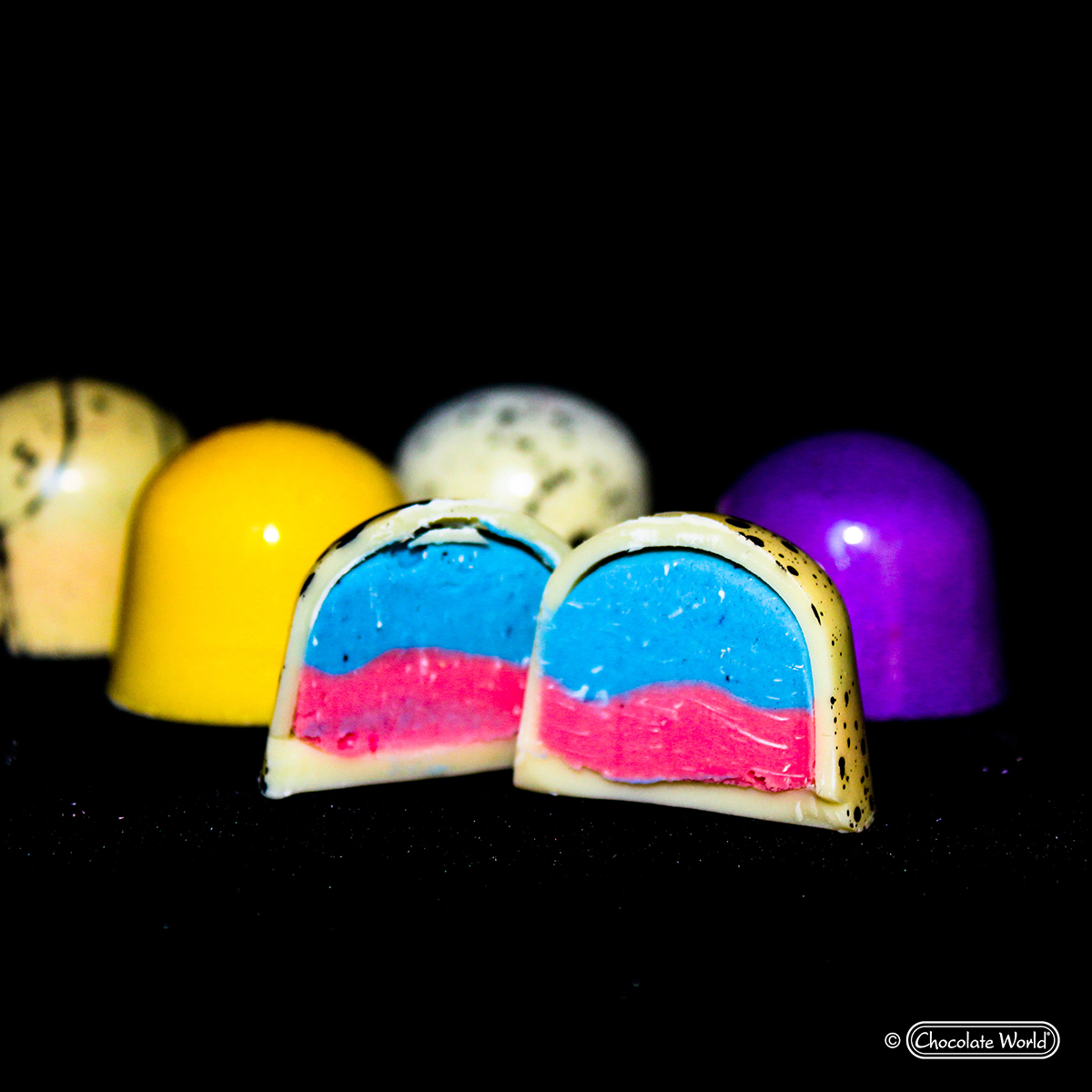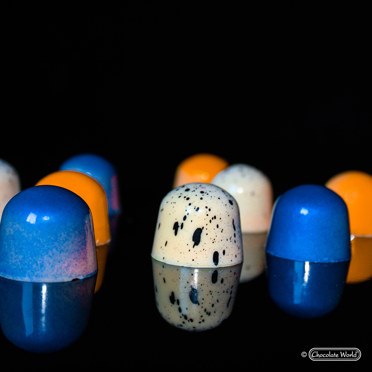 Polycarbonatform für die Herstellung perfekter Schokoladenpralinen. Diese hochwertige europäische Form lässt sich einfach verwenden, Ihre Schokolade wird eine glänzende und glatte Oberfläche haben und sich leicht lösen lassen. Um bunte Schokoladenstücke zu erhalten, tragen Sie eine dünne Schicht farbigen Kakaobutter auf die Form auf, bevor Sie sie mit Schokolade füllen. Das Design dieser Form ermöglicht das Formen perfekter Figuren mit sauber bearbeiteten Linien.
