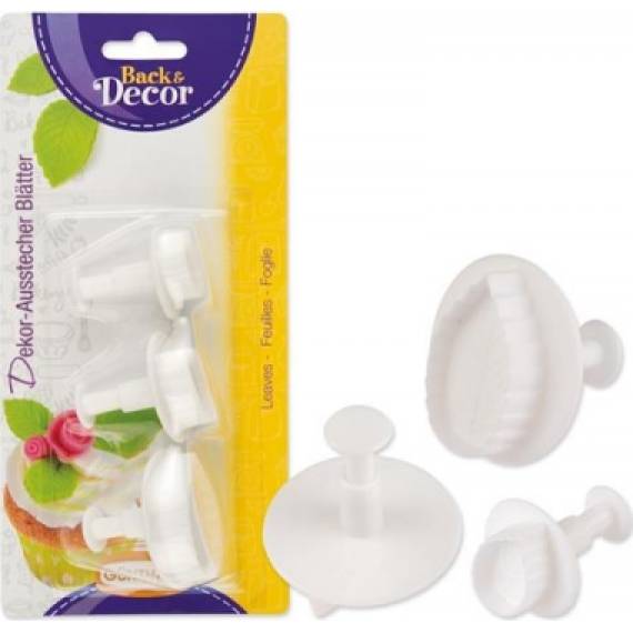 Ausstecher in Blattform für Fondant. Kunststoff-Ausstecher erleichtern die Arbeit bei der Gestaltung von Tortendekorationen. Dieser Ausstecher ist spülmaschinenfest; im Set sind 5 verschiedene Größen enthalten. So können Sie kleinere oder größere Blätter nach Belieben gestalten. Abmessungen 105 x 57 x 220 mm / Cutter: 30 x 20 mm / 35 x 24 mm / 45 x 30 mm.