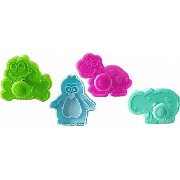 Frosch, Schildkröte, Nilpferd und Pinguin – diese vier Formen findest du in diesem niedlichen Ausstechformen-Set. Es handelt sich um Ausstechformen mit Druckmechanismus, die im Grunde Ausstechformen und Prägeformen in einem sind. Die ausgestanzte und verzierte Form lässt sich durch das Drücken des Kolbens aus der Ausstechform lösen. Die Ausstechformen eignen sich sowohl zum Ausstechen von Fondant als auch für Weihnachtsgebäck oder Plätzchen. Die Abmessungen einer Ausstechform: 47 x 45 x 18 mm. Material: Kunststoff.