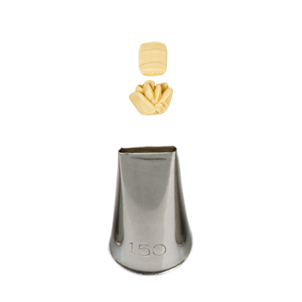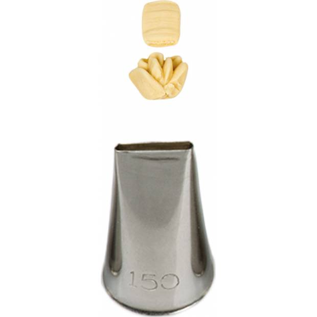 Konditorflach-Patisserie-Tülle zum Erzeugen glatter Linien aus Sahne. Damit lassen sich mit ihr Streifen sowie Blüten gestalten. Lochgröße: ca. 1,3 x 0,2 cm.