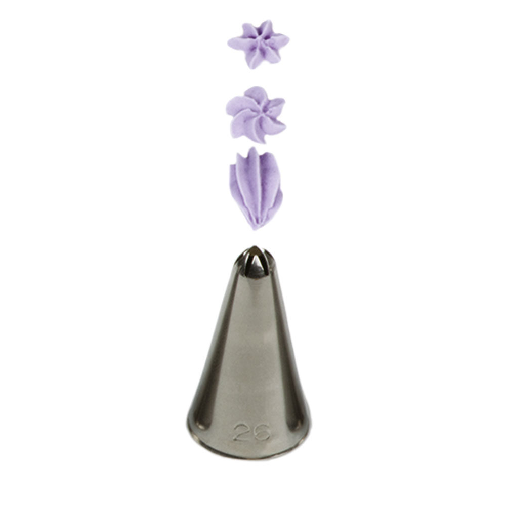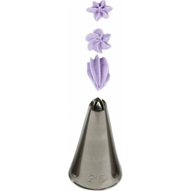 Metall-Spitzöffnung für Backkunst 26 garantiert Ihnen eine präzise und einzigartige Verzierung. Die Spitze kann wiederholt mit einem Spritzbeutel verwendet werden. Sie ist aus Edelstahl gefertigt, Rückstände von Fett bleiben auf der Oberfläche nicht haften. Nicht spülmaschinengeeignet.