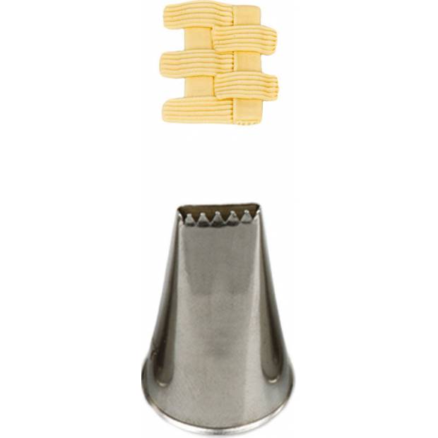 Metall-Tüllenspitze flaches Netz-Muster Nr. 47 für einfaches Erzeugen kreativer Creme-Elemente. Die Spitze kann wiederholt mit dem Spritzbeutel verwendet werden. Sie ist aus Edelstahl gefertigt; Fettflecken bleiben auf der Oberfläche nicht zurück. Nicht geeignet für die Spülmaschine.