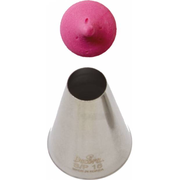 Eine Metall-Gebäckdekorationsspitze rund S/P16 sorgt für eine genaue und einzigartige Verzierung. Die Spitze kann wiederholt mit einer Spritztüte verwendet werden. Sie besteht aus Edelstahl, Fettflecken hinterlassen keine Spuren auf der Oberfläche. Spülmaschinenfest ist sie nicht.
