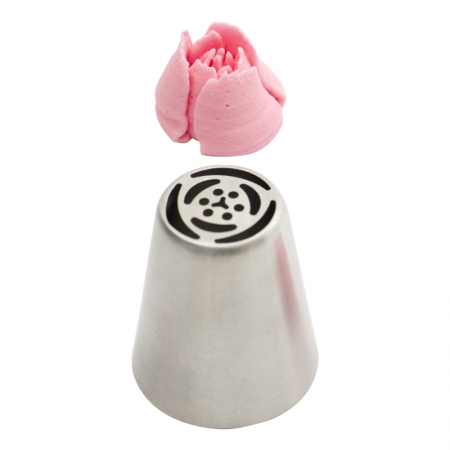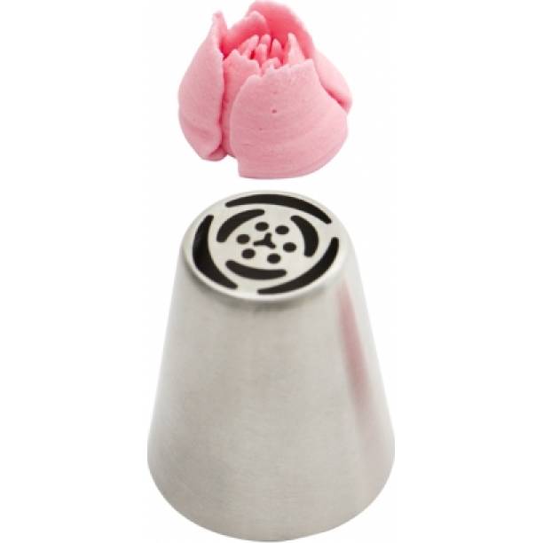Der russische Metall-Verzierungsaufsatz Nr. 21 für Gebäck garantiert eine präzise und einzigartige Verzierung. Der Aufsatz kann mehrfach zusammen mit einem Spritzbeutel verwendet werden. Er ist aus Edelstahl hergestellt, Fettflecken bleiben nicht auf der Oberfläche zurück. Spülmaschinenfest ist er nicht.